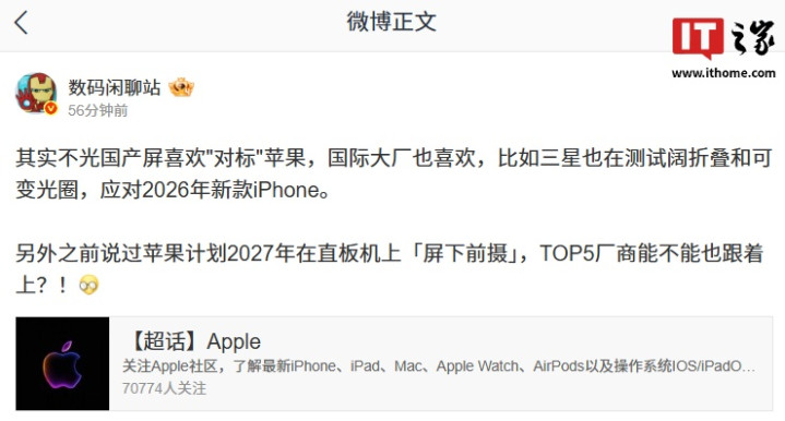 值得一提的是,苹果计划2027年在直板机上「屏下前摄」,博主还“催促”TOP5厂商也跟着上。